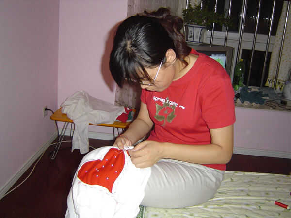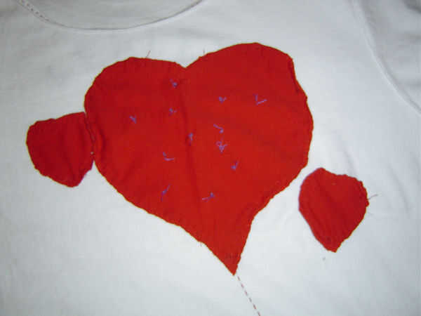 luego tijeras un corazón grande y dos pequeñas delante de la camiseta, vuelva a colocar paño rojo y coser con hilos rojos. coser las perlas en el gran corazón. coser una línea roja de corazón a la parte inferior de la camisa, que al igual que un cometa lleno de corazón.