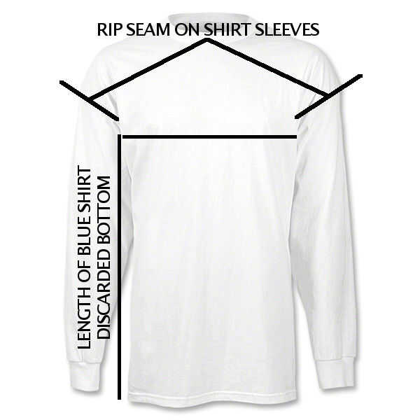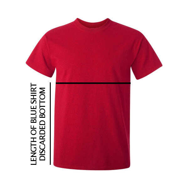 Antes de manipular los otros 2 camisas, tome la parte inferior de la camisa azul simplemente cortar y medir desde el dobladillo hasta su nuevo corte. Agregue cerca de 1 pulgada (o unos 25mm) para esa longitud. Esta será la longitud a cortar las otras 2 camisetas.