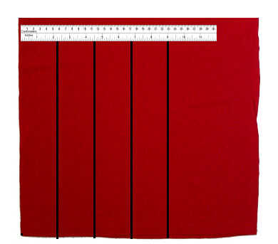 Con los fondos de las camisetas de rojos y blancos cortados, su regla recta y marca de las tiras en ambos que son del mismo tamaño en cerca de 2.25"(alrededor de 60mm). Debe saber cuánto alrededor estás, así que simplemente medir y cortar a una serie de rayas igual a lo grande a tu alrededor son, además de 2 rayas, pero recuerdan crear el mismo número de rayas rojas y blancas. También: trabajar diligentemente para hacer todas las franjas del mismo ancho. Es sorprendente lo fácil que es para hacer este traje se vea descuidado si las rayas no son el mismo ancho.