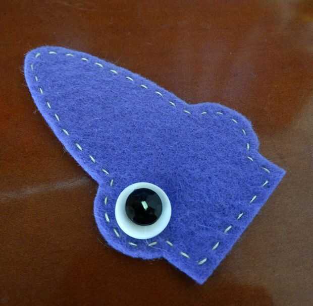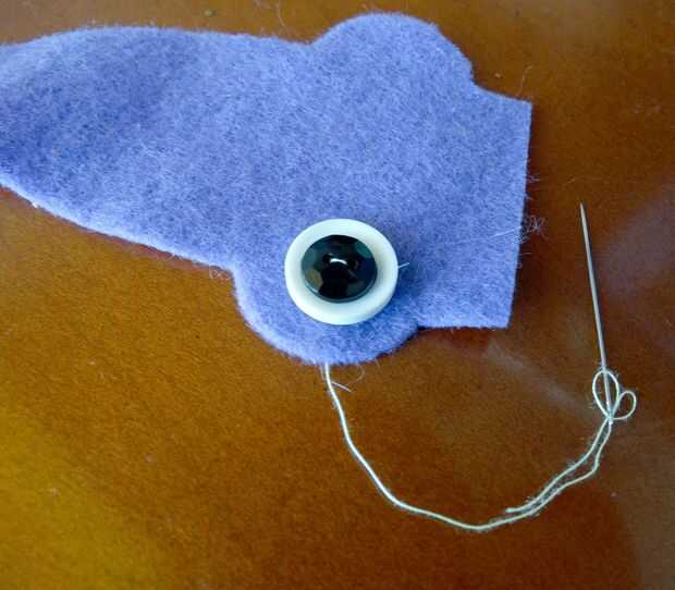 Utilizar hilo y aguja para colocar el botón de color más grande, la luz dentro de uno de los zócalos del ojo. Asegúrese de que para programar el botón ligeramente en el borde por lo que es enmarcado por la curva del fieltro.