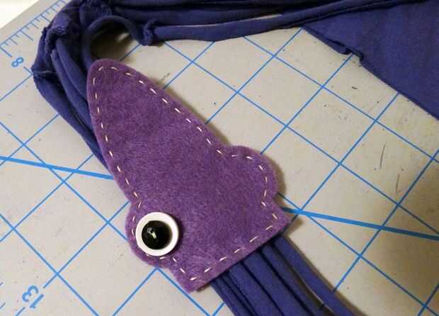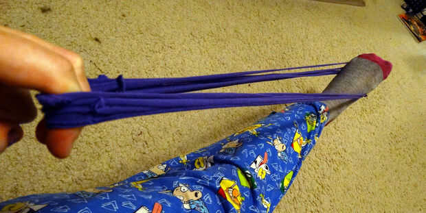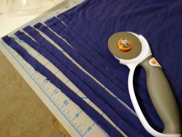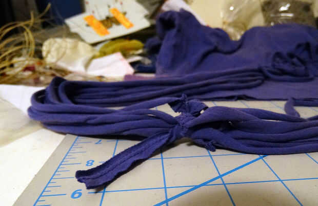 Paquete juntos tus franjas de la camiseta y luego jale para estirar. Las tiras se alargan y los bordes rodará bajo crear anillos redondos agradables.