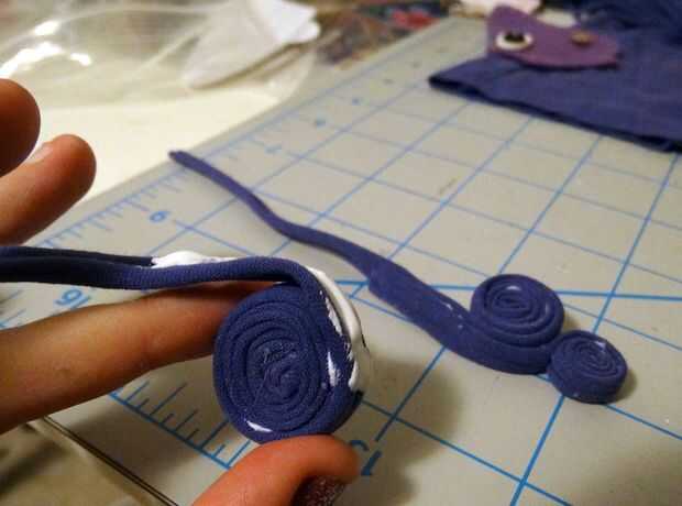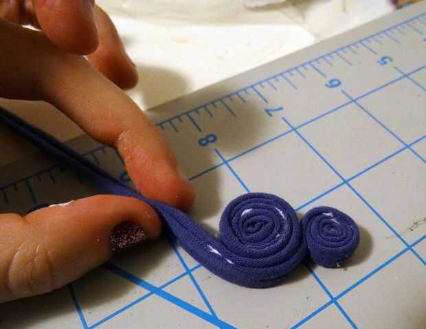 Combinar diferentes bobinas tamaño juntos, bajada grande a pequeño, crea una forma orgánica muy agradable. Aplique pegamento en la parte posterior de una bobina y presiona en el espacio negativo justo debajo otro. Agrupación de tentáculos de esta manera permite a su tela piezas para apoyarse mutuamente, a la estructura de la pieza. Propongo hacer un grupo de 3-5 las bobinas para un cuerpo de calamar de 4 pulgadas.