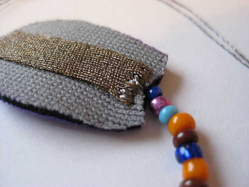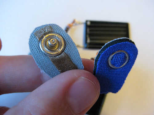Cuando haya terminado de ambos lados y ambos son igualmente largas. Cortar dos piezas de forma de pequeñas gotas de neopreno (también puede usar otro tipo de tela resistente). Fusible de una tira de un lado tela conductora de cada una de estas gotitas. Coser uno de sus cuentas hilos conductores para el extremo angosto de una de estas gotitas. Conexión hilo conductor con tela conductora! Y para coser perlas hilo conductor en el extremo estrecho de las otras gotas. Ver las fotos.