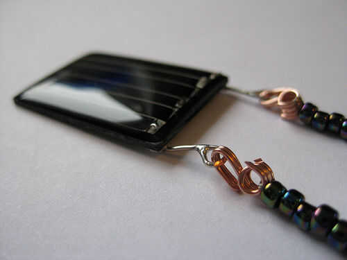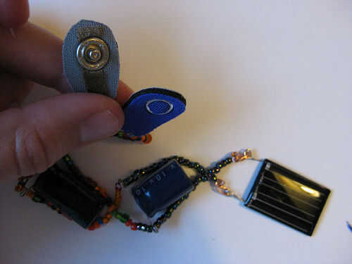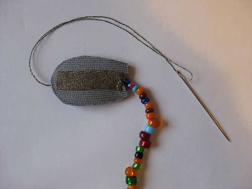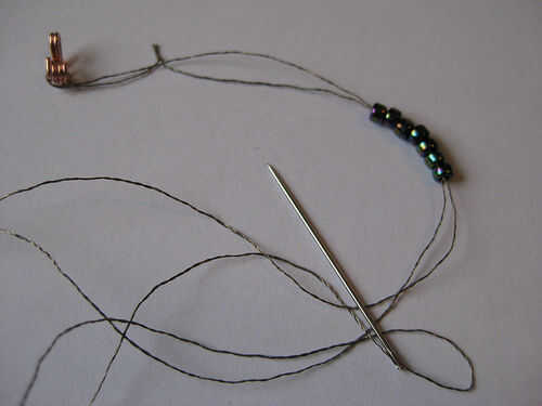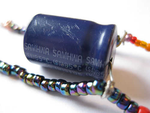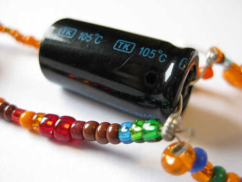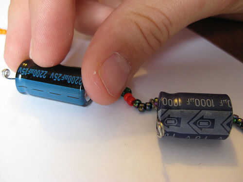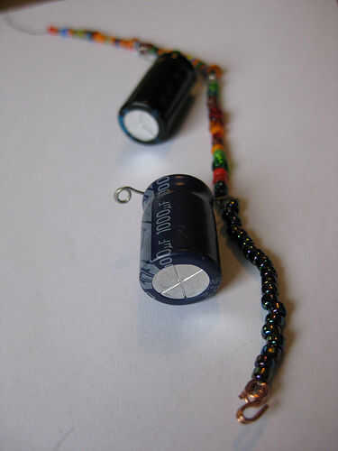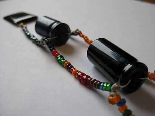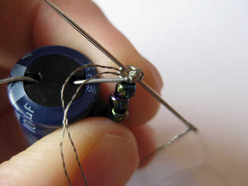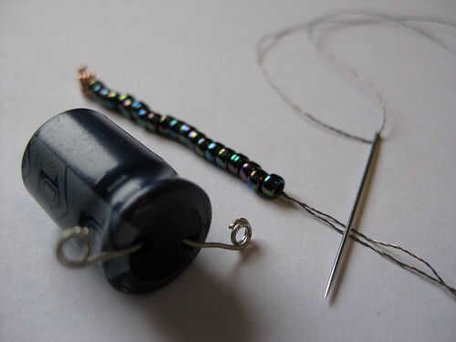 Ahora pase una pequeña (por lo que se ajusta a través de los granos) aguja con el hilo conductor. Toma doble. Coser a través de uno de los lazos de los ganchos que acaba de hacer y fijarla. Ahora empezar a ensartar bolas en este hilo. Tantos como la longitud de su primer condensador, además de algunos más. En mi caso fue 20 granos. Hacer lazos con los cables de sus condensadores (sin necesidad de soldarlos) y coser todo el lazo de su condensador un par de veces antes de continuar con bolas de hilo en la cadena. De nuevo utilice suficientes granos para cubrir la longitud de su segundo condensador, además de algunos más. Al conectar el segundo condensador Asegúrese eso si cosió a la pata negativa del primer condensador que lo mismo para el segundo. Ahora hacer lo mismo para el otro lado, conectan los lados más juntos. Ver las fotos.