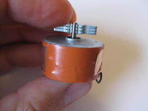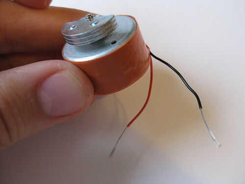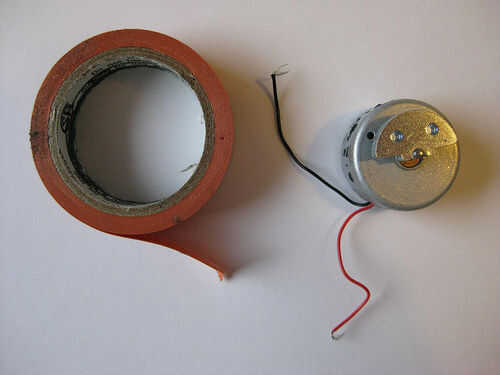 Primero empezar por aislar la cáscara del motor con una tira de cinta de aislamiento. Entonces tira de unos 2 cm de ambos cables del motor. Ahora, en lados opuestos del motor, con cinta adhesiva los extremos de los cables por debajo de trozos de 1 x 0,5 cm de cobre conductor cinta con adhesivo conductivo.