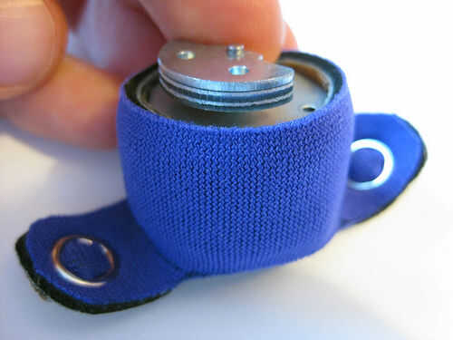 Ahora usted desea cortar un trozo de neopreno que es tan alta como su motor y aproximadamente 1cm más corto que la circunferencia. Esto hará que la bolsa lo suficientemente apretada como para mantener su motor en su lugar. No olvides agregar dos fichas separadas uniformemente - para que al cerrar el círculo, las pestañas se peguen hacia fuera en lados opuestos. Ver las fotos.