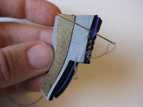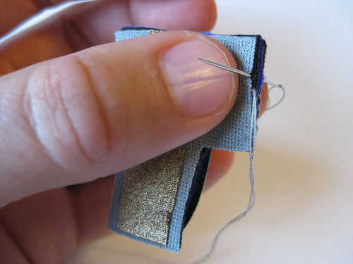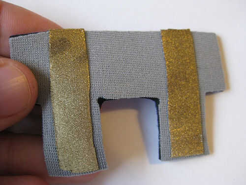 En el interior del neopreno del fusible de dos piezas de tejido conductor que harán contacto con las piezas de cinta de cobre y llegar hasta el final al final de cada ficha.