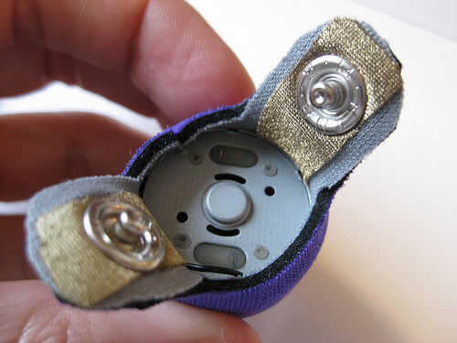 Ahora cose la bolsa neopreno juntos y añadir dos poppers a cada ficha colocar el motor interior y asegúrese de que la cinta de cobre se alinea con el tejido conductivo. Hasta ahora no importa qué lado de los motores va dónde, ya que sólo cambia la dirección, que el motor está girando.