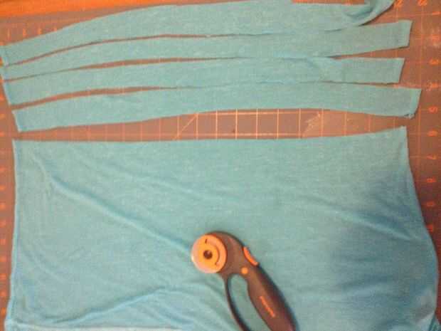 Cortan tiras de una pulgada de la cintura de la camisa. No te preocupes si son perfectos o no. No verás los bordes cuando todo termine.