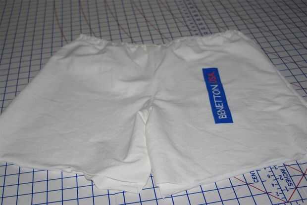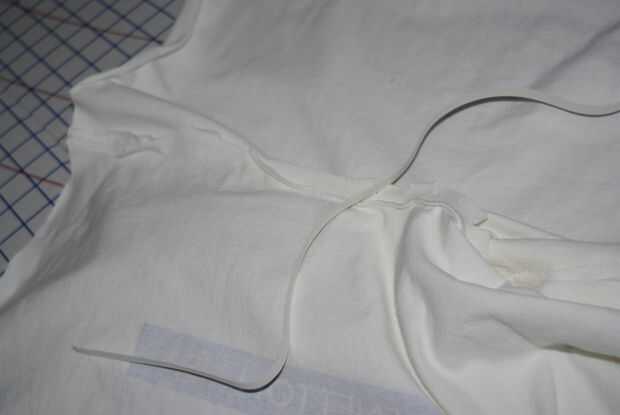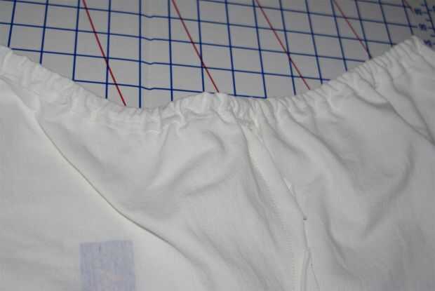 Terminar las costuras según sea necesario.  Algunos punto cierres apretados y Po' niña piensa que es un desperdicio de hilo hasta el final de una costura que no se verá de todos modos.  Yo las costuras cosidas hacia abajo en las áreas en la parte superior de la cintura antes de ellos a coser para el elástico.  (Pido disculpas que estas fotos son un poco difíciles de ver detalles.)  Esta manera al girar el tejido debajo de la cubierta elástica, el elástico no conseguir detendrá por su tela de costura.  Sólo tiene 1" de la carcasa ya que va a utilizar ropa interior elástica que es delgada, de 1/4" - 1/2" y muy elástica.  Te vas a arrepentir utilizando el elástico del pantalón ancho y pesado cuando se intenta dormir en ellos.  El elástico, liderando con un alfiler en el extremo del hilo de rosca y empuje hasta que vuelves a lo mismo del agujero le izquierda cuando la caja de costura.  Unir los extremos del elástico, superposición y coser bien.  No se molestó acabado mi dobladillos de pantalón de pierna tampoco.  Usted puede si lo desea.  Debido a corte de la camiseta, los paneles de las patas posteriores eran un poco más y ya que este fue un proyecto realmente rápido y lento, no me molesté en recortar para acabado.
