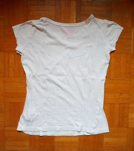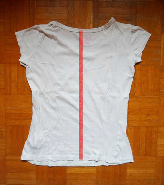 poner en una mesa mirando hacia atrás y con cinta de sastre, tratar de encontrar el centro de su camiseta a traza una línea desde arriba hacia abajo.