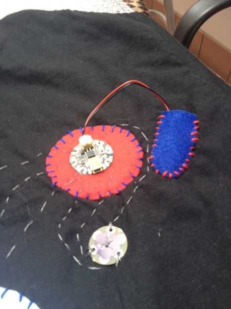 Puesto que la camisa tiene que ser algún tipo de fuente de alimentación, os adjunto una pequeña batería a cada gemma para mantener la camiseta powered! Hice pequeños bolsillos para mantener las baterías para que se vea bonito. Simplemente lo hice con hilo color de fieltro y el bordado.