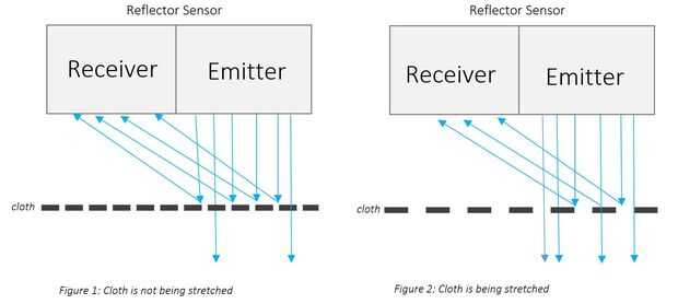 Un sensor reflexivo que contiene un emisor y una parte del receptor se coloca contra la tela. Cuando la tela no se estira, mucha luz IR que es enviada por el emisor se recibe otra vez por el receptor. Cuando la tela se estira hay menos material delante del sensor que significa que menos luz infrarroja se refleja en el paño y recibido por el receptor. En nuestro producto esta diferencia se utilizará para dar las advertencias para el usuario. Esta diferencia debe evocar un zumbador, el sonido o la vibración para dar feedback al usuario sobre su postura.