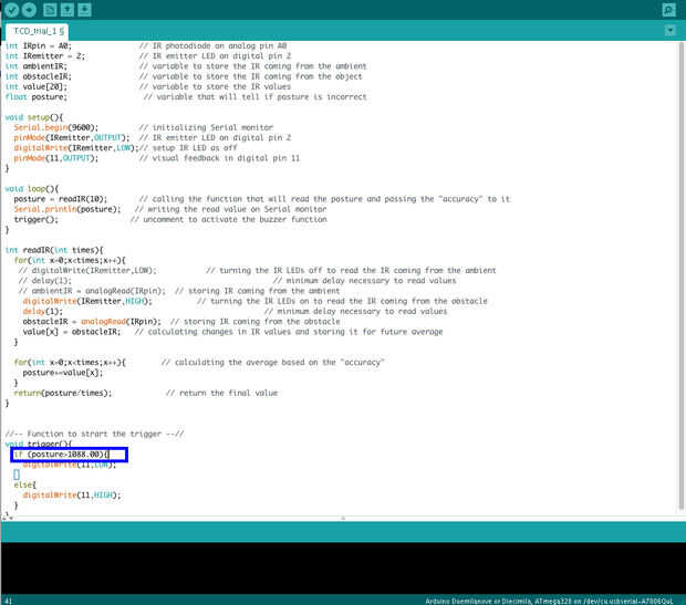 Mover la postura de rectas a flexión posición y compruebe el cambio de los valores de la 'postura' en buscar a monitor (accesible desde el icono de lupa en la esquina superior derecha del interfaz de Arduino). Cambie el valor en el código el valor promedio más bajo usted ve cuando está sentado en posición de flexión.