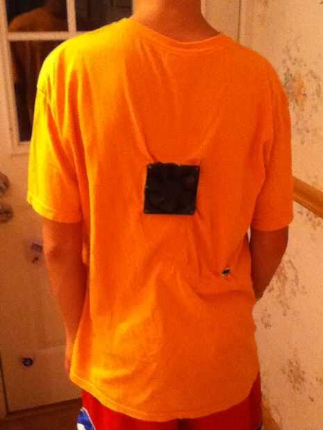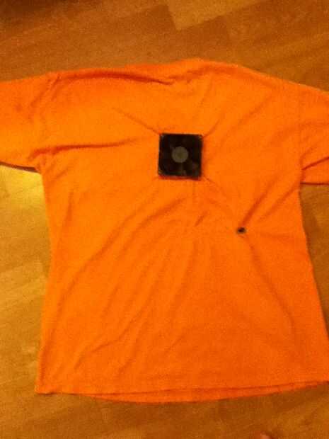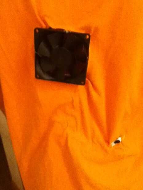 La manera que es configurar los circuitos de esta camiseta es para que una batería de 9v se ejecuta a través de un interruptor que determina si es o no el ventilador en. Todos los cables y la parte inferior del interruptor se cubren con el relleno para la comodidad como se puede ver en uno de los cuadros. Si lo desea, puede mantener la batería de 9v y el clip en el bolsillo para no salir cables ni baterías.