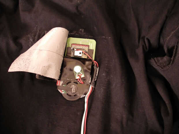 Conducto de cinta el escáner y la grabadora a la tarjeta de plástico cualquier manera que puedas. Mina no es linda pero funciona. Permanentemente no se conectarlos ya que eventualmente tendrás que lavar la camisa. En serio. Lavar la ropa. Chicas pueden conseguir sobre la obsesión de Knight Rider, pero no el hedor.
