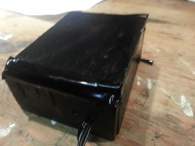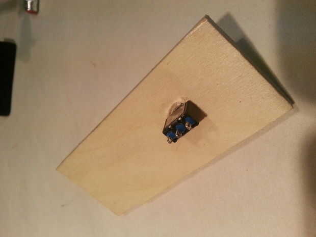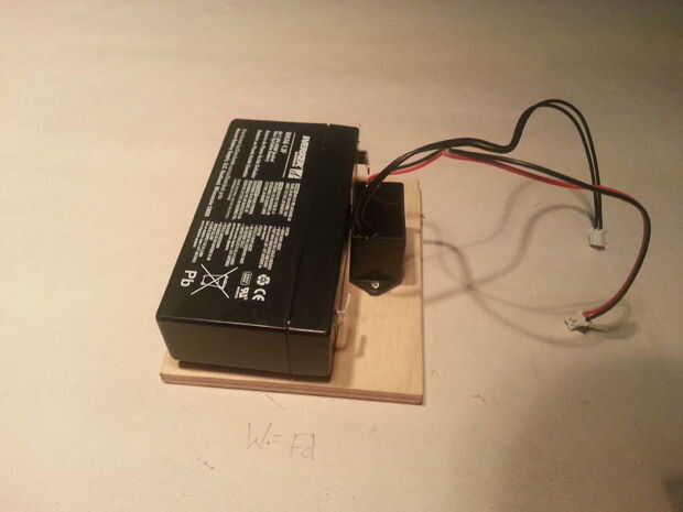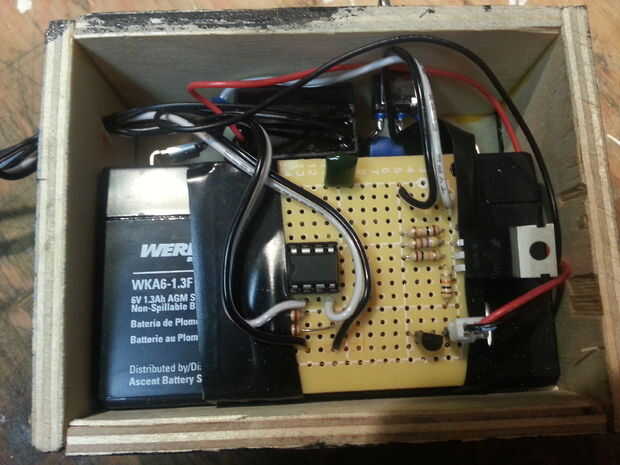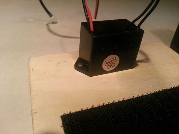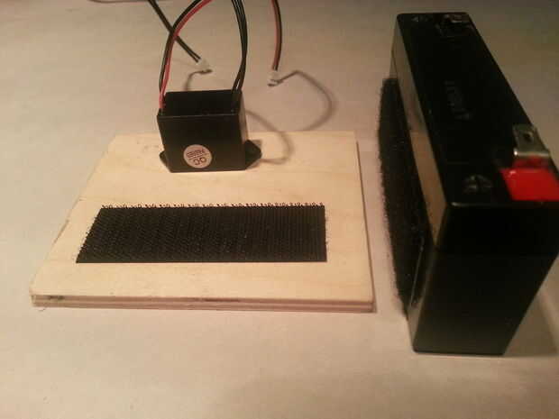 Después de hecho todos los cortes, clavó el inversor a la pieza inferior de madera para la caja. Los extremos de los clavos eran cortados y presentados. El velcro se utiliza para mantener la batería en su lugar.