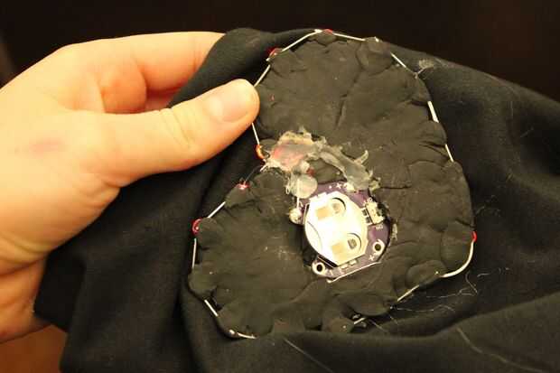 Poner pequeños puntos de pegamento caliente en la parte delantera del circuito y presiona en el interior de la camisa. Luego, corte un pedazo de tela similar a la forma del circuito y corte los orificios sobre la batería y el interruptor y el pegamento caliente sobre. Y ya está!