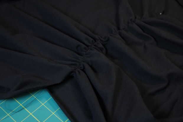 Hacer puntadas grandes hacia abajo el centro del delantero de la camisa. Tire de él para crear pequeños frunces. En pequeñas puntadas, coser sobre él otra vez para bloquear reúne.
