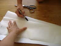 Mi hija quería una falda amplia. Desde la parte superior (donde medimos 6,5"), medida a lo largo de la línea de doblez de la longitud que desea la falda y haga una marca. En la parte inferior del papel doblado donde hiciste la marca de longitud, medir de la tapa la mitad del ancho que desea que el panel. En nuestro caso es 7" desde el doblez del papel, haciendo que el ancho de la parte inferior de cada panel 14". Cortar el papel sobrante de la parte inferior del panel y luego dibujar una línea en el lado abierto del papel de las mejores marcas a las marcas de fondo.