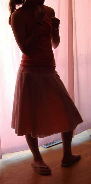 Mi hija quería ojete con una enagua de color rosa. Si utilizas ojete allí es una derecha a la tela y necesita que vaya a coser desde la parte inferior de la falda en cada panel de manera que queden alineados los bordes del orificio. Tenemos que llevar en la cintura. Entonces pin juntos el cuerpo de la falda y la cintura y meta en lugares por lo que se ajusta a la cintura. Montaje de la pretina es más un problema cuando se utiliza a dos telas de la falda juntos. Virar a continuación, deje que mi hija pruebe. Si a ella le gusta la apariencia yo coserlo bien.