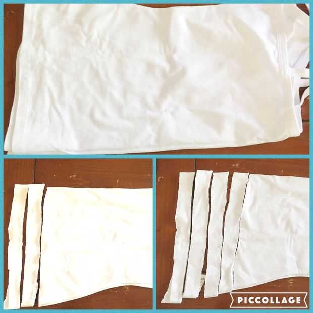 Para preparar una camiseta sin cortar para convertirse en camiseta hilo/cuerda, comience en la parte inferior de la camisa y cortar 3/4-1" tiras de ancho. Mantener corte tiras hasta llegar a los brazos, que usted también cortará (pero no la utilizaremos para hacer la cuerda).