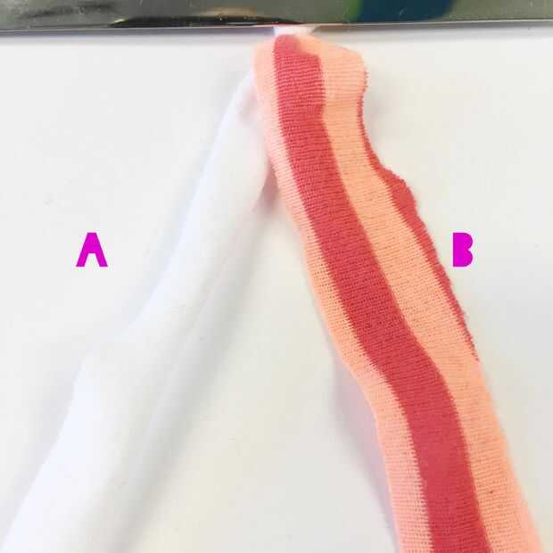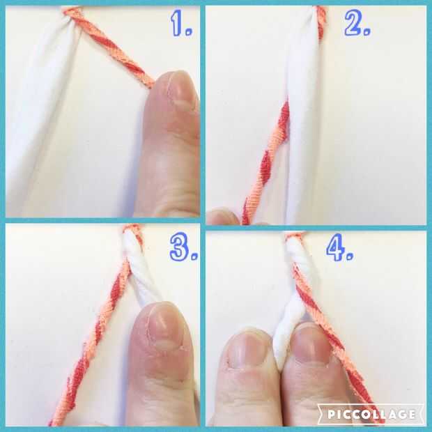 En la primera foto que he etiquetado las dos tiras de "A" (franja blanca) y "B" (franja naranja rayas). Sujete la tira A mano non-dominate y tomar tira B en su mano dominante. Con tus dedos pulgar e índice, gire la tira B con la torcedura va fuera (en la dirección que apunta mi dedo en la foto 2, cuadro 1). Para ello tan firmemente como pueda como la más estricta la torcedura, más segura es.