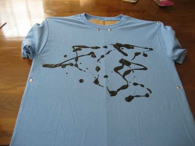 Poco de pintura en la camisa de slop. Deben hacer algunas manchas y salpicaduras. No intente tirar intencionalmente un diseño.