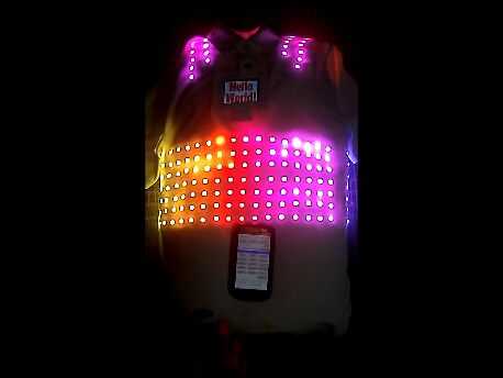 Camiseta de LED casera con 324 direccionable WS2812B LED. Controlado con Arduino pro micro ligado a LCD de pantalla táctil y Bluetooth para teléfono Android de la bobina todo lo hecho en casa (circuito camisa código, la aplicación teléfono, diseño de camiseta, cadenas de LED de la cinta). Visualizar imágenes guardadas en la tarjeta SD, todo otro totalmente cambiables de la pantalla o aplicación (colores, velocidad y texto). Con camisa encendida estás más brillante entonces cualquier strobe o foco en cualquier fiesta. Camisa se ponen calientes cuando los LED se enciende.