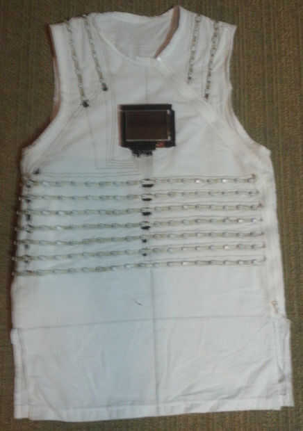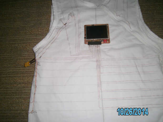 La camisa de matriz de LED utiliza componentes circuitos suaves para crear una resolución baja, desplazamiento de tablero de mensajes y la plataforma de videojuegos que puede ser controlado con una palanca de mando en una camiseta. Fue una de mis pri