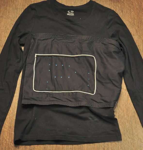 En lugar de coser la matriz directamente en la camiseta, la matriz es cosida sobre un panel de tela que se une a la parte delantera de la camiseta con Velcro. Es mucho más fácil coser sobre un panel de tela plana que una camiseta de curvas, y esto nos permite quitar el panel y utilizar en otros proyectos.
