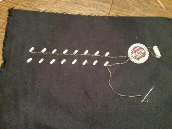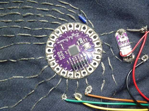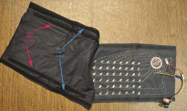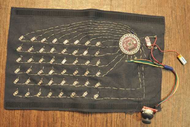 Al conectar el LED, empezamos a coser las primeras dos filas con el hilo conductor - bucle varias veces a través de cada ánodo de LED para garantizar una buena conexión. También se adjunta la fuente de alimentación para el "+" y "-" pasadores en el Arduino. El hilo conductor es bastante grueso, así que utiliza una aguja con un ojo grande. Utilizamos una simple puntada para coser las filas sobre todo en la parte superior de la tela, planea cruzar las columnas en las filas para evitar cortocircuitos. Al atar apagado el hilo al final de una fila o columna, he atado un nudo pequeño y utiliza una gota de pegamento para tela sobre el nudo, por lo que podría recortar el hilo cerca del nudo sin riesgo de colapso. Antes del resto de las filas de la costura, cosió dos columnas y corrió una prueba en los circuitos completados con cuatro LEDs. La prueba funcionó bien, así que había pegado al resto de los LEDs y había cosido el resto de las columnas. Escribí un programa simple para encender cada LED a su vez, y periódicamente probamos los LEDs que hemos cosido para asegurarse de que las conexiones eran buenas y no hay cortocircuitos. Cosió el tablero de suministro de energía con la batería de LiPo para la tela y cosió la conexión a la Arduino LilyPad. Nos hiere para arriba con pernos {A0, A1, A2, A3, 3, 4} de los ánodos (columnas) y pins {5, 6, 7, 8, 9, 10, 11, 12, 13} para los cátodos (filas).