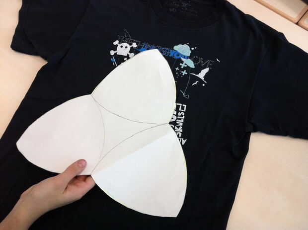 1.) después de hacer la plantilla de papel en cualquiera desea forma (aquí es para el principio), se puede utilizar para experimentar con la posición de su diseño de la camiseta. Pensar en la forma tridimensional de las bolsas acabadas - a veces incluso recortada diseños pueden darle el aspecto especial.