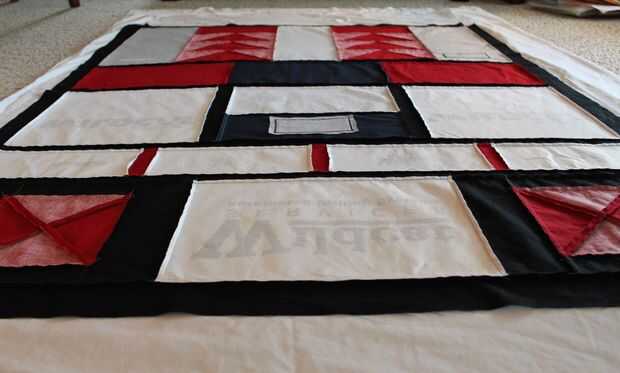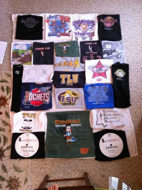 Punta: mantener el equilibrio de color (sombras / luces) y la intensidad de emblemas (ocupados / no ocupados) en la mente cuando se ponen las camisas hacia fuera. Trate de darks alternadas luces y ocupado / no ocupado tanto como sea posible. Vale la pena el tiempo para probar varios diseños diferentes y tomar una foto de cada uno con su teléfono (tendrás que estar parado en una escalera o una silla para hacerlo porque quiere ser lo suficientemente alta para capturar el diseño en general). Desplazarse por las fotos ofrece una rápida comparación visual y una imagen realmente vale 1 mil palabras, usted sería sorprendido por la claridad que ofrece para la selección del diseño.
