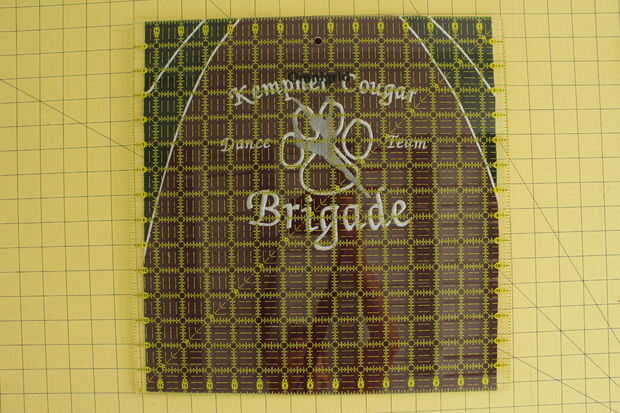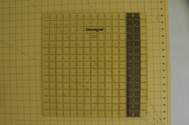 - Coloque la parte superior de la colcha de vuelta en la hoja de piso. Recorte un extremo de los 4 de las tiras de la frontera de 2.5". 2 lugar de la frontera las tiras en el medio todo el ancho del tejido (tenga cuidado de mantener juntos los extremos recortados y alinee los extremos recortados con el lado izquierdo de la parte superior de la colcha), medir la anchura media para confirmar que es lo que prevé (debe ser muy estrecha, especialmente si usted oprimió como cosen). Con una regla de acolchar, uniformemente las tiras de la 2 frontera en el borde derecho de la marca y cortar con tijeras o rotary cutter.