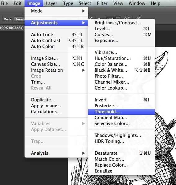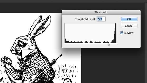 Cuando tienes una idea de lo que quiere la plantilla en su camisa, tomar esa imagen e insertar a Photoshop. En la parte superior de ustedes buscar de la barra "imagen" luego ir a "ajustes" > luego umbral, ajustar el umbral por lo que se ve bien.