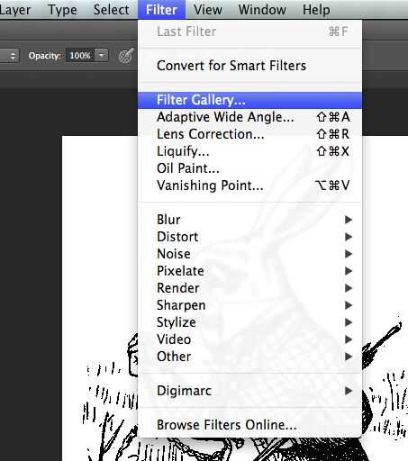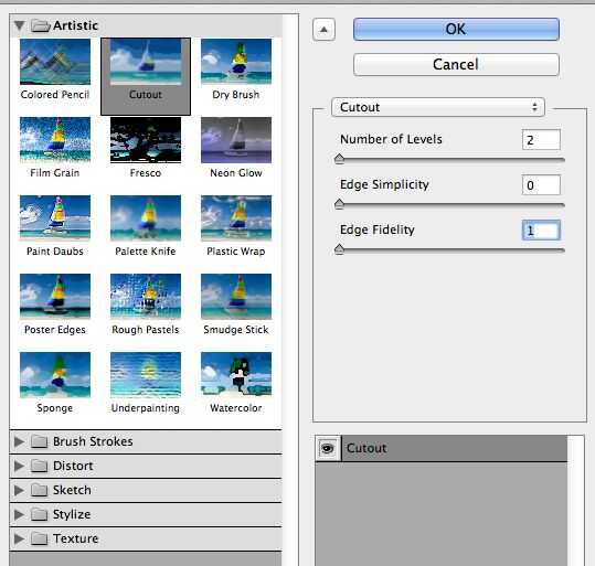 Luego volver a la parte superior de la barra y encontrar el "filtro" luego ir a "Galería de filtros", elegir recorte y coloque todos los valores de mínimo.