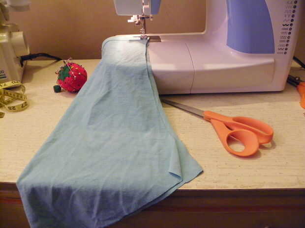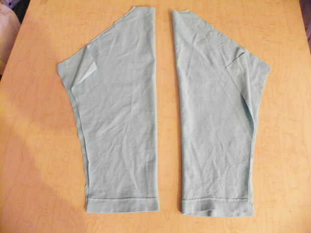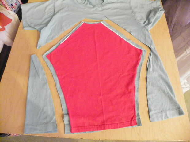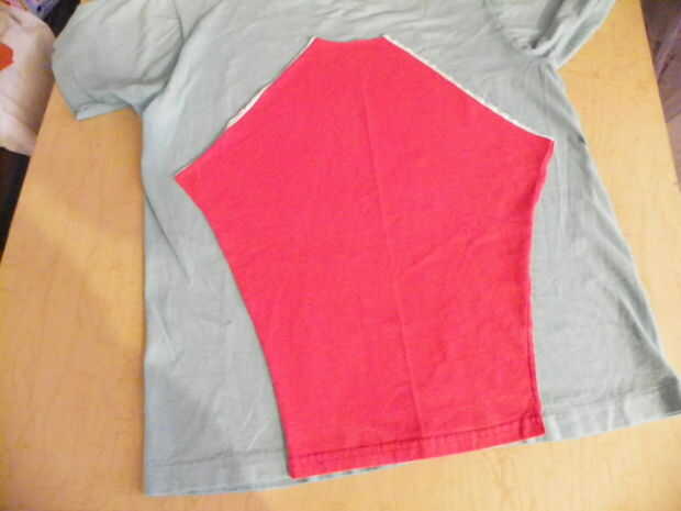 Alinee el dobladillo de la camiseta con el dobladillo del patrón y cortar dejando un margen de costura extra. Recorte de mangas. Doblar cada lado equivocado de la manga hacia fuera y coser la costura bajo el brazo.