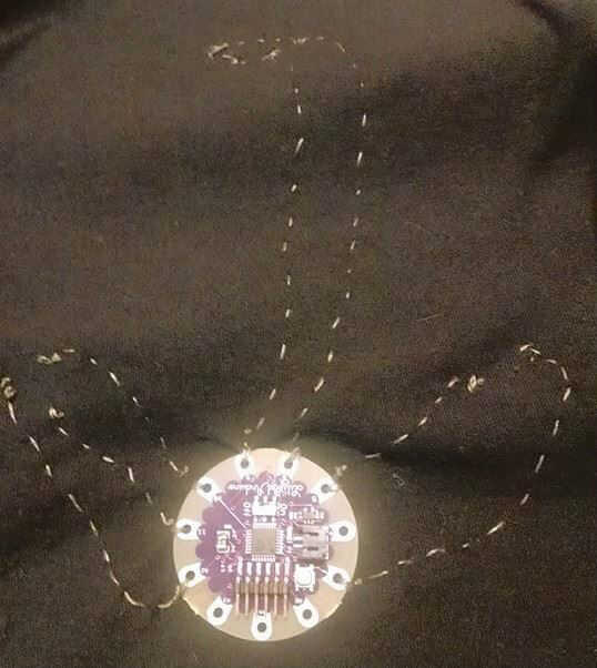 1. Coloque los distintos componentes (LEDs, zumbador, sensor) que desee según el plan. A partir de la Junta, coser el hilo conductor a través de Arduino 'pétalos' (agujero) varias veces para asegurar una fuerte conexión. Luego, otra vez siguiendo el plan, coser para los correspondientes componentes '+' o '-' o de ' spot. POR ESTA RAZÓN QUE PLAN!
