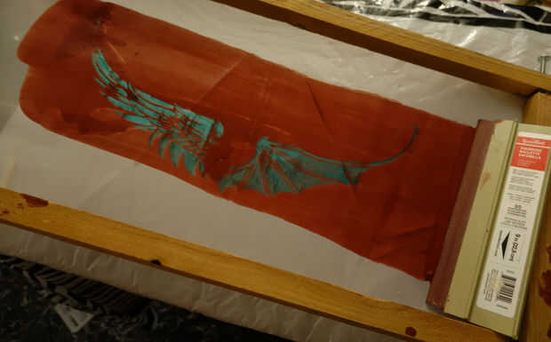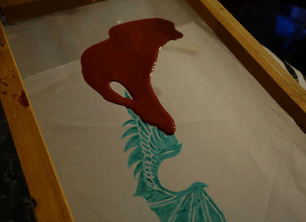 Una vez seco el líquido, mantener el bastidor en ángulo a la superficie de trabajo. Trabajando en el mismo lado que usted pintó el dibujo fluido en, derramaré la pantalla de llenado de arriba hacia abajo. Puede que desee utilizar la escobilla de goma para ayudar a empujar, pero no quiere ir en las mismas áreas mucho. Idealmente usted quiere sólo uno o dos pases. Es mejor añadir demasiado relleno que poco – usted quiere hacer absolutamente seguro que cubra su área de diseño además de una feria poco a ambos lados, ya que no desea sangrado a través de alrededor de los bordes... a menos que sea parte de su diseño la tinta! Con mi cuerpo, he podido Vierta el tipo de relleno extra en la botella por inmersión la esquina dentro de la botella y dejar que escurr en allí. Probablemente no es aconsejable, pero bueno, estamos todos los rebeldes. En cualquier caso, establecer su marco de nuevo secar horizontalmente. (Otra vez, sin tocar ninguna superficie. Cuñas. Calzas, mi amigo.) Este material también se seca bastante rápidamente, pero asegúrese de que esté seco antes de que usted vaya cachondeo con él. Usted debe luz comprobarlo nuevo – que he usado un pincel para rellenar cualquier manchas realmente finos.