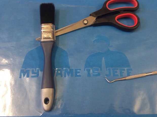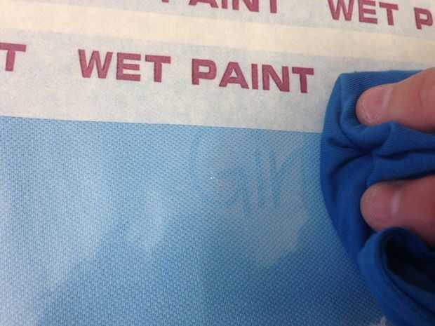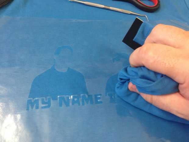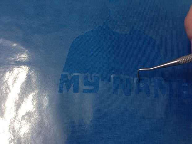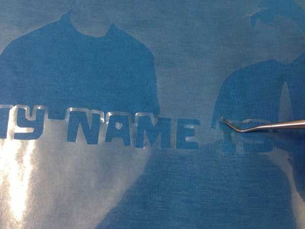 Una vez que han impreso su plantilla, utilice cinta de enmascarar o cinta de transferencia para mantener todo en su lugar. Alisar cuidadosamente la plantilla de vinilo en la tela que desea imprimir (elegimos camisetas) y levante suavemente la cinta adhesiva o transferencia. eliminar las zonas que no quieres (donde la pintura necesita penetrar) utilizando una herramienta de gancho o sonda.