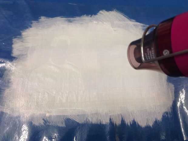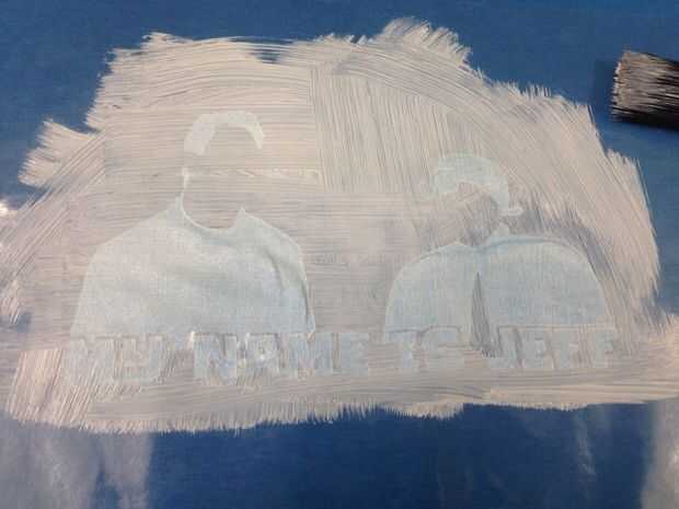 Aunque estamos usando tinta de impresión de pantalla, realmente nos estamos esténcil, así que usamos un pincel en lugar de una escobilla de goma para pintar nuestro diseño. Cepilló la pintura a través de primero presiona la pintura con un movimiento de punteado. Hemos encontrado que una o dos capas de pintura estaba bien para la mayoría de los colores, pero la tinta blanco requiere varias. Una vez que estés feliz, cuidadosamente Quite la plantilla de vinilo y las instrucciones del fabricante de la pintura de la curación. En nuestro caso, este significado usando una pistola de aire caliente o secador de pelo para calentar por unos minutos, luego de plancharlo. Esto cura la tinta, fijándolo en su lugar.