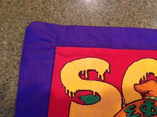 Tome su hoja y cortar una tira de 3" la longitud de la fila superior. Corte el otro para la parte inferior. Coser las tiras en la parte superior e inferior de la cuadrícula de la camiseta, al igual que las filas de costura juntos. Ahora cortar dos tiras más para recortar los lados. Estas tiras será una longitud diferente de la primera serie así que asegúrese de medir desde la parte superior de la rejilla en la parte inferior como superior e inferior de ajuste. Coser las tiras de lado hacia la rejilla.