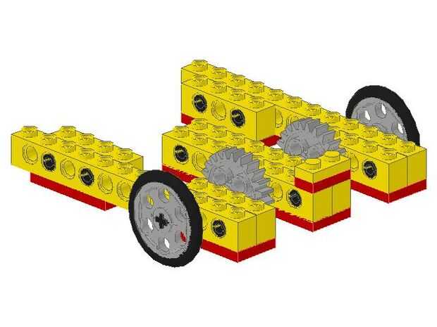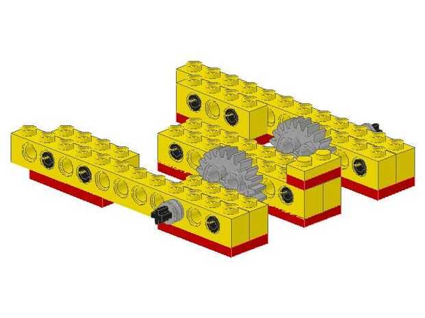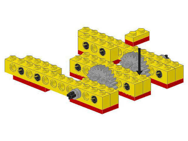 Flip cuidadosamente el conjunto hacia atrás sobre (con postes de madera orientadas hacia arriba). Añadir dos 1 x 2 placas al final de las vigas centrales. Añadir medio poleas con anillos a los dos extremos de eje extendido.