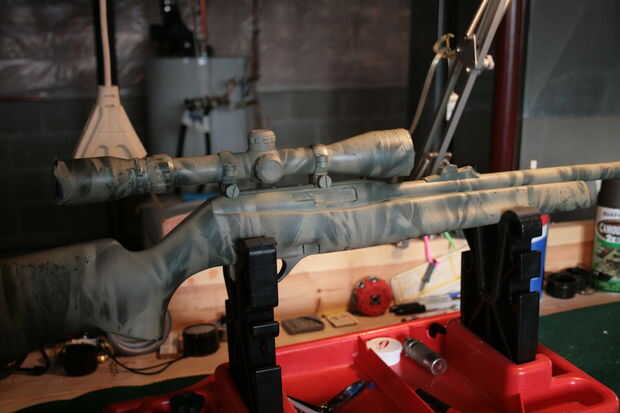 Para desaparecer su arma de fuego en el paisaje, usted tiene que aplicar algún pensamiento a la pintura de su arma. Normalmente, un rifle presenta una línea larga horizontal, generalmente oscura y descarnada que destaca muy bien. Así que para ocultar la forma de la pistola y romper el contorno y la superficie metálica para que se descolora en el fondo, primero necesitamos cambiar el color entero de la pistola más cerca al color de fondo natural de la zona que se caza.