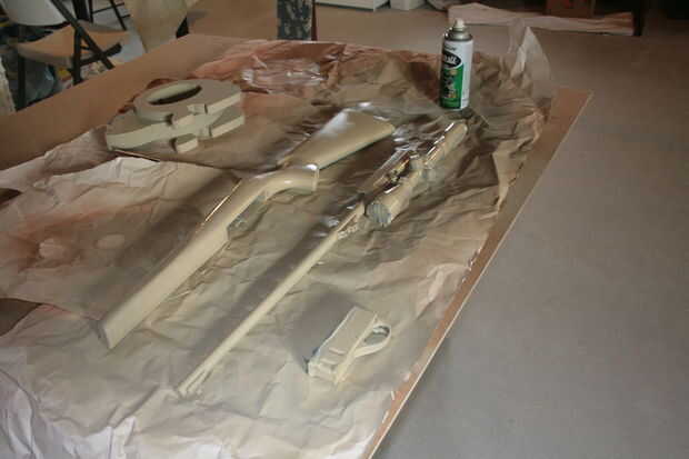 Utilizando el color más claro como la capa base trae la pistola toda el color básico de fondo natural que se utilizará. (Para mí es praderas y bordes de bosques en su mayoría). Usé el color caqui para dar la pistola este colorante básico. La primera capa debe ser ligeramente rociado, casi más de una capa de tachuela para ayudar a la pintura posterior se adhiera bien. Una vez que su secado, en una segunda capa, asegurándose de que no hay ningún goteo funciona o manchas.