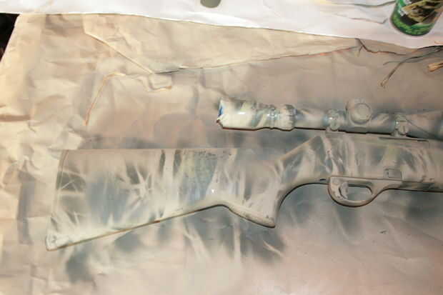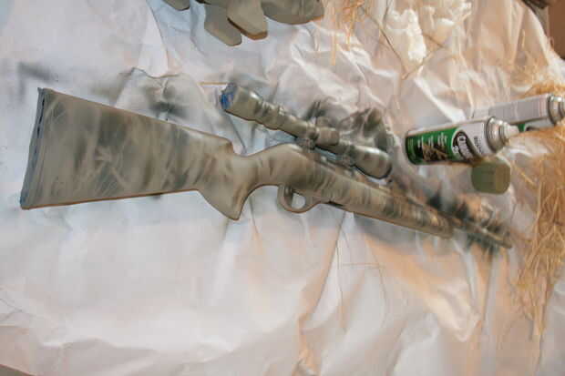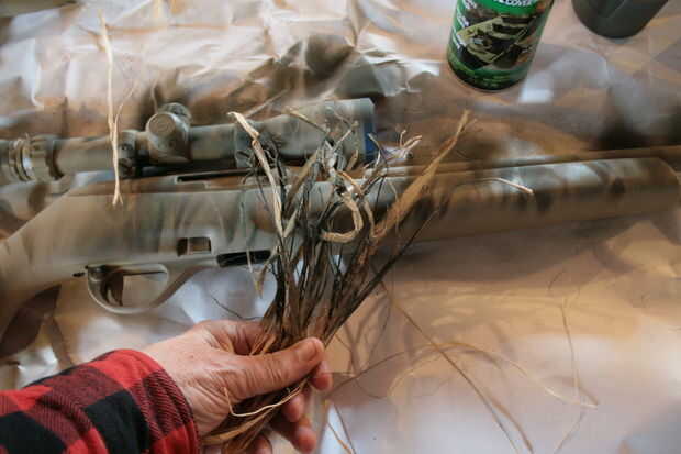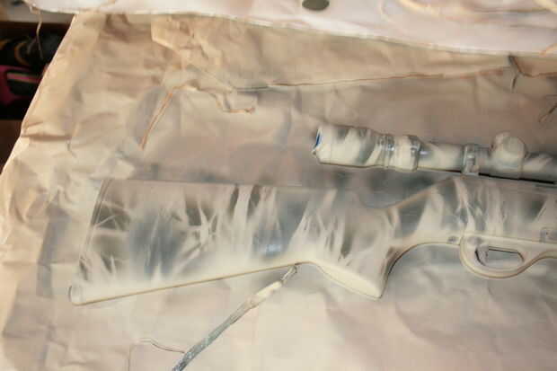 A pintura debemos aplicar la pintura de una manera que se rompa para arriba la línea horizontal de la pistola contra el fondo y con elementos verticales que cambio la forma de la pistola de una línea plana que es horizontal, a zonas de estructura vertical. Estos cambio la imagen de la pistola a un desenfoque en el fondo con las líneas verticales más naturales en la naturaleza. (para ello utilizamos las plantas artificiales y gramíneas y plantas secas para actuar como una especie de patrón en el que forma de las áreas de pintura en líneas verticales o casi verticales.)