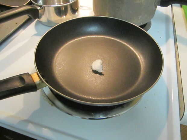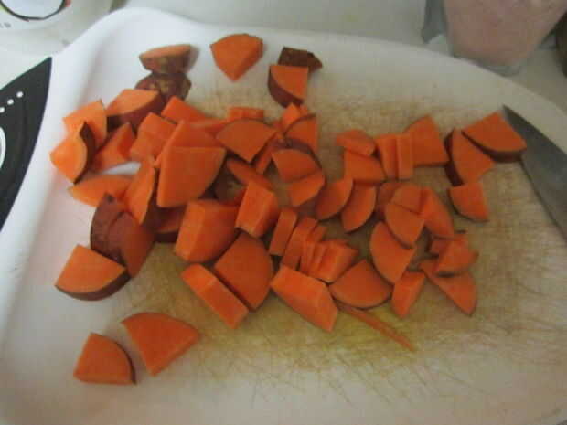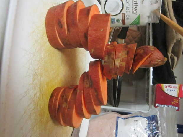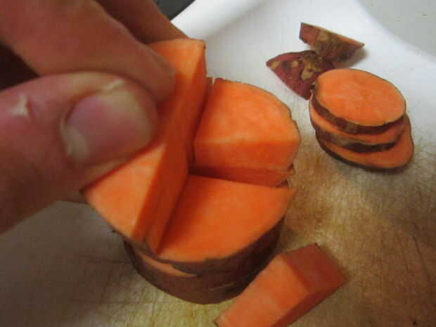Enjuague sus papas y picarlas no obstante, por favor. Cuando no estoy horneando les en el horno, me gustan que ya sea picado fino en discos o en cubos. Ser creativo. Construir pirámides de patata dulce mientras espera su bandeja para calentar para arriba. Añadir suficiente aceite de coco a la cazuela, para que todos los trozos pueden compartir la riqueza. Empezar con alrededor de una cucharadita a una cucharada de calor una sartén grande a fuego medio y añadir el aceite.