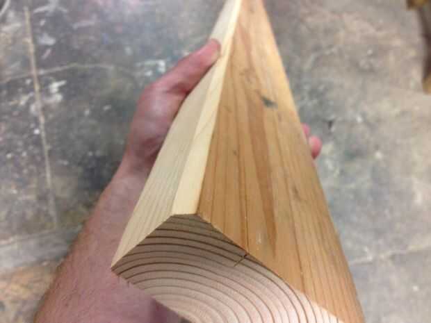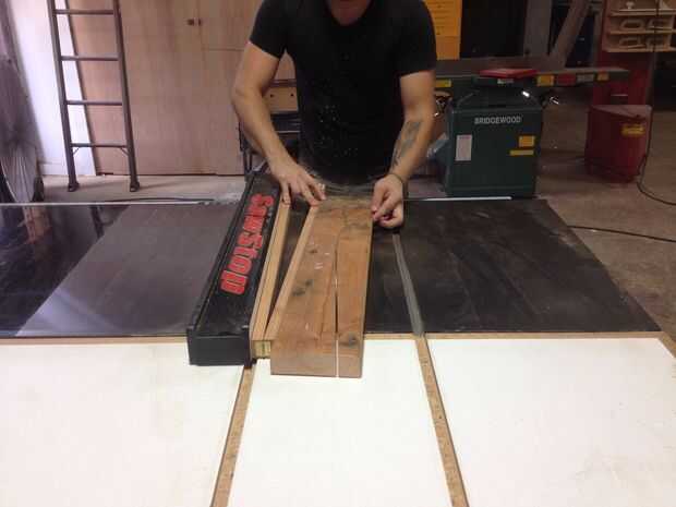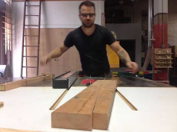Hicimos las piernas con 2x6s de pino recuperada. Para sobrehilar hasta la madera, tome un 1/4" de cada lado de su stock con la Sierra de mesa. Entonces, usando la chuleta de sierra, cortar 28" espacios en blanco en un inglete de 5 grados. Los ingletes deben ser paralelos a uno otro. Hacer 4 espacios en blanco.