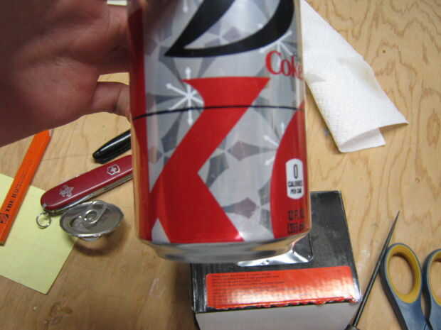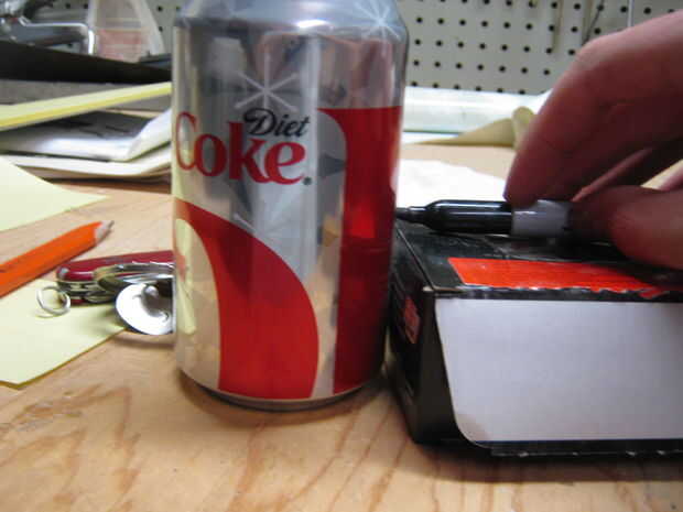 encontrar una caja o algo alrededor de 1 1/2 pulgadas de alto y coloque un rotulador en la parte superior, luego tomar la prensa puede (derecha arriba) contra la punta del marcador y girarlo para conseguir una buena línea recta alrededor de la.